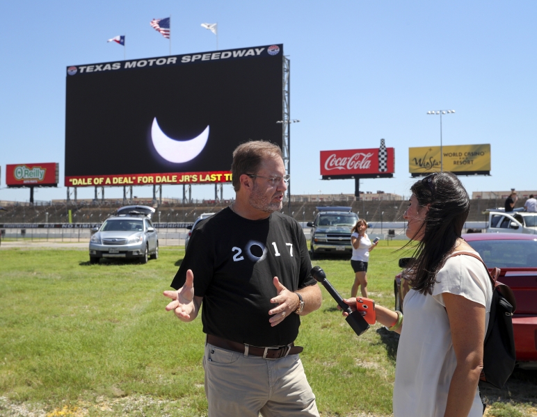 Between 200 and 300 visitors rolled into the Texas Motor Speedway infield to park, unfold the lawn chairs and enjoy the historic day on the Guinness World Record-holding “Big Hoss,” which features more than 23,000 square feet of high-definition display area. The speedway filmed the eclipse with a special video camera filter from the grandstand rooftop and aired it live on “Big Hoss” and Facebook Live.