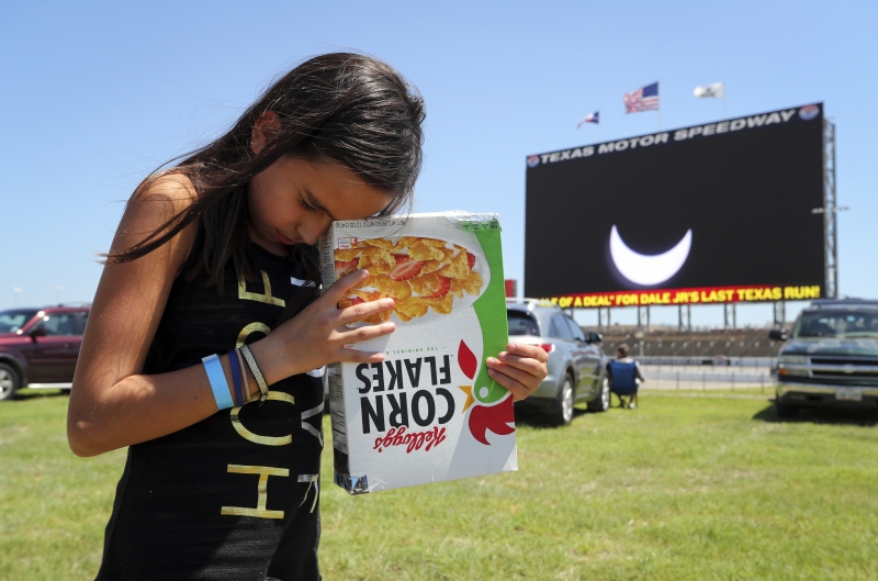 Some visitors set up as if it were a race weekend with music blaring, cocktails in hand and hanging out on the viewing deck atop their truck. Others brought their families in tow, with plenty of children in the infield enjoying the special event. One young girl from Denton skipped school today, but it was for a just cause. She worked on two science projects that would allow her to see the solar eclipse without the special glasses, including a Kellogg’s Corn Flakes box with aluminum foil. She was successful with both.