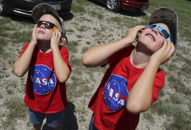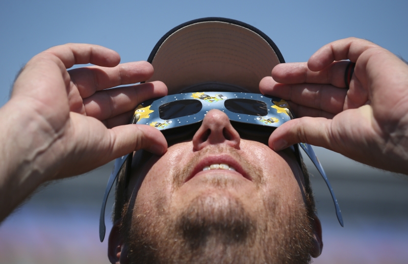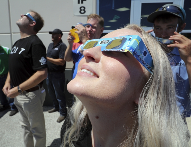 Texas Motor Speedway staff watch the solar eclipse from the infield at the speedway on August 21, 2017 in Fort Worth, Texas. Millions of people have flocked to areas of the U.S. that are in the “path of totality” in order to experience a total solar eclipse. During the event, the moon will pass in between the sun and the Earth, appearing to block the sun. Fort Worth residents will see about 75 percent of the sun blocked by the moon. (Photo by Richard Rodriguez/Getty Images)